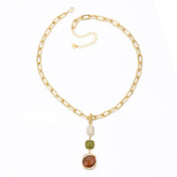 Collana con catena in brass dorato e pendente con elementi pavè di zirconi clear, ad intarsio in cat eye pietra di luna-nero/ruggine-oliva/violet-acqua.