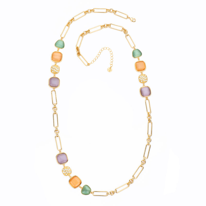 Collana con catena in brass dorato con carrè ondulati in pavè di zirconi clear, cat eye violetto, avventurina e pesca.