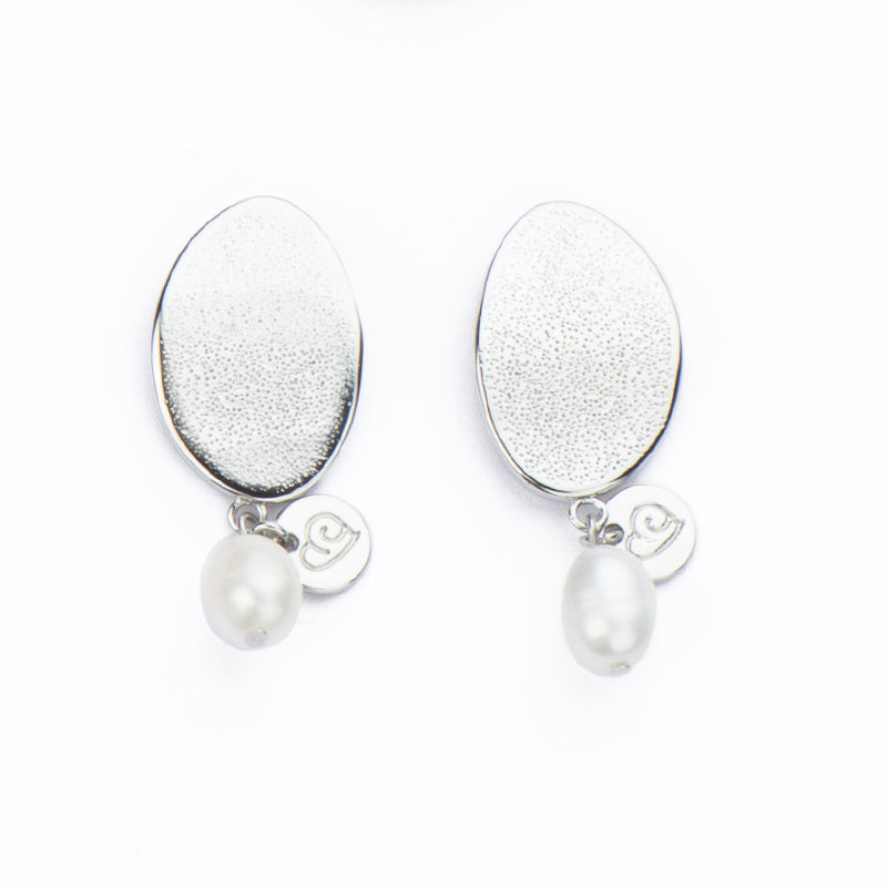 Orecchini con top in brass rodiato/dorato a forma di petalo con effetto sandy e pendente in perla di fiume.