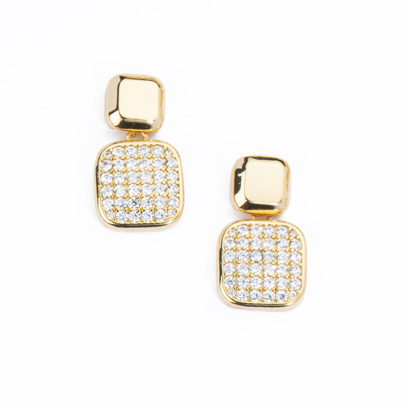 Questi orecchini con top e pendente a carré stondato in brass, liscio e in pavé di zirconi clear, regalano un effetto elegante, luminoso e contemporaneo.