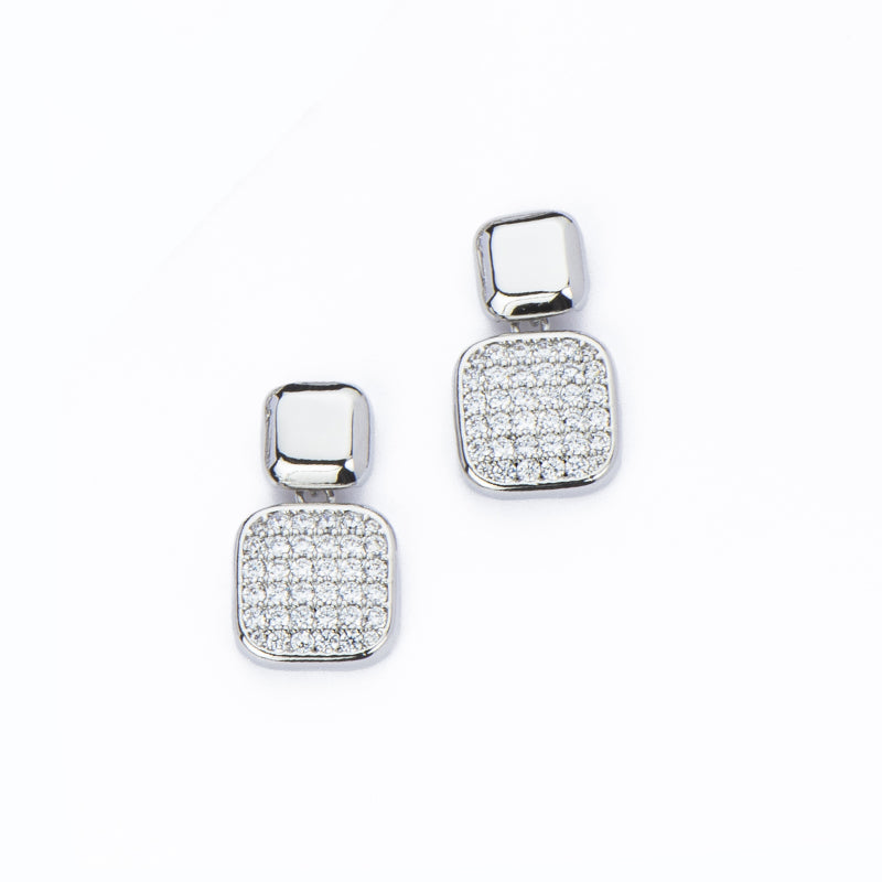 Orecchini con top e pendente carré stondato in brass rodiato/dorato liscio e in pavé di zirconi clear.