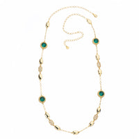 Collana con catena intervallata da cristalli smeraldo/rubino con frame corona ed elementi in brass dorato liscio e con pavè di zirconi clear.