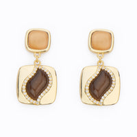 Orecchini con top carrè con cat eye violet/Lt. peach e pendente in brass dorato con intarsio a foglia verde mela/chocolate e frame di zirconi clear.