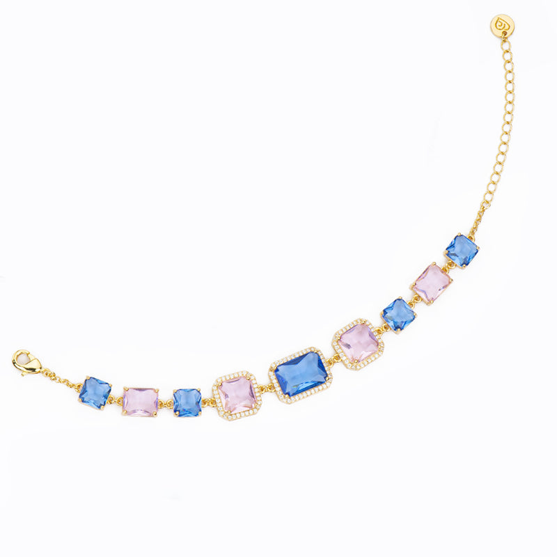 Bracciale con cristalli carrè e rettangolari alternati con frame lisci in brass dorato e con zirconi clear. Disponibile nelle varianti di colore: