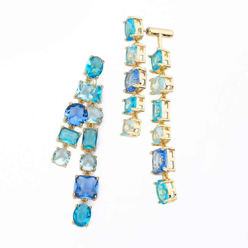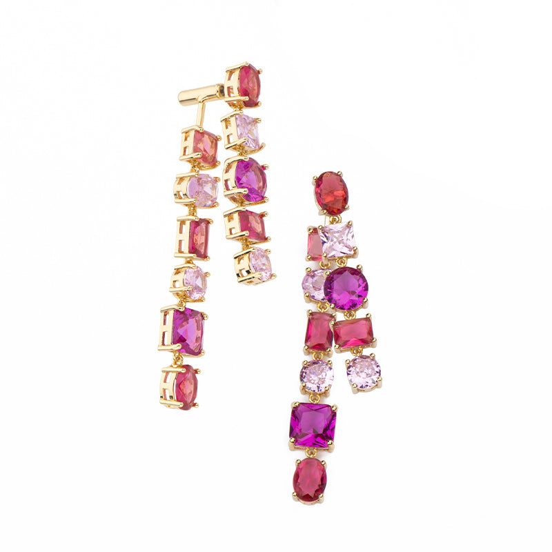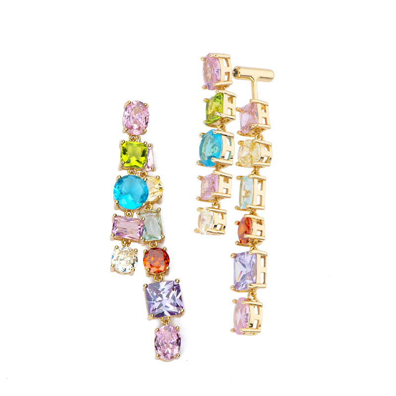 Orecchini con top con perno e cristalli pendenti dal taglio mix multicolore/multirosa/multiblu alternati con frame in metallo dorato.