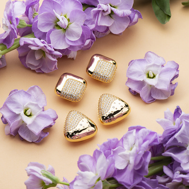 Questi orecchini con top a forma di rombo in brass bombato liscio, completati da una piramide in pavé di zirconi, regalano un effetto moderno, sofisticato e luminoso.