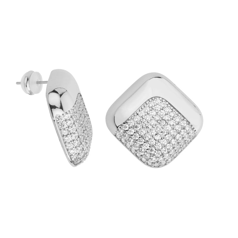 Orecchini con top a forma di rombo in brass bombato liscio e con piramide in pavé di zirconi. Disponibile nelle varianti di colore: