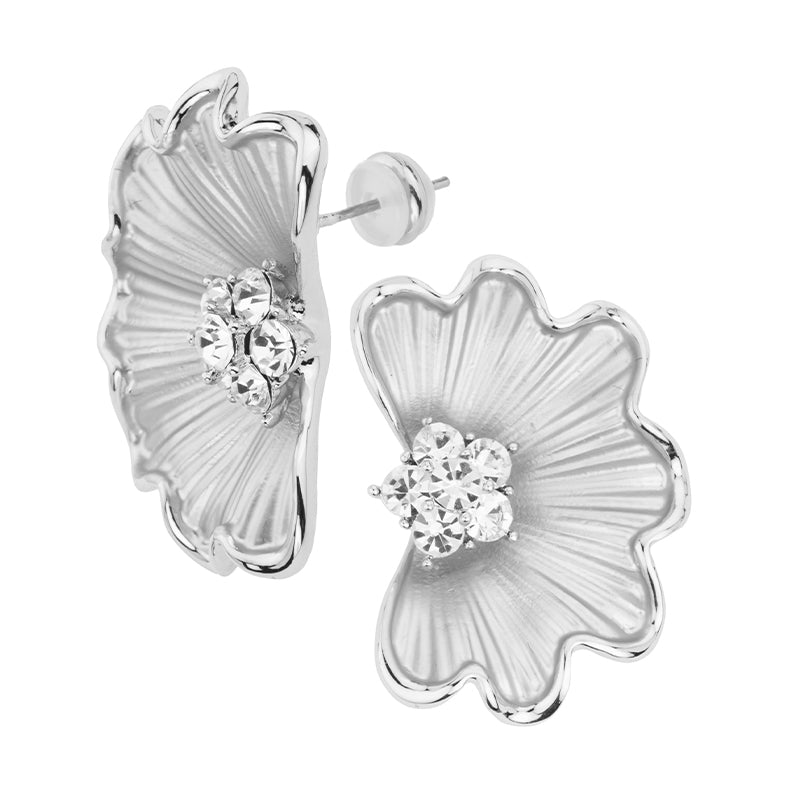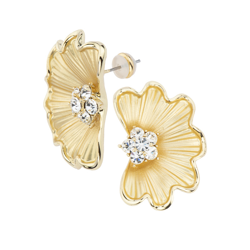 Questi orecchini in brass effetto sandy rigato a forma di ventaglio, con zirconi clear centrali, sprigionano un fascino materico e luminoso dal gusto raffinato e originale.