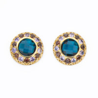 Orecchini con top a forma di sole in cristallo blue/amethyst con zirconi coffee e lavander/apple e pink con frame in brass dorato.