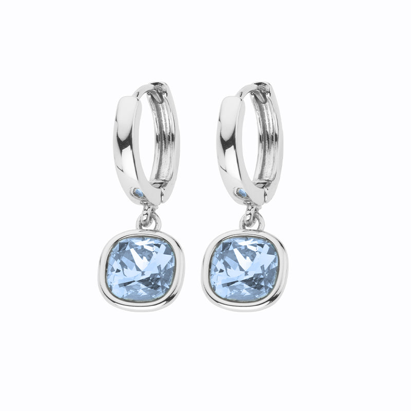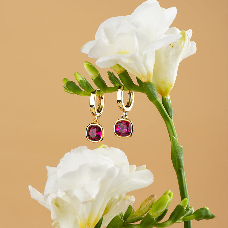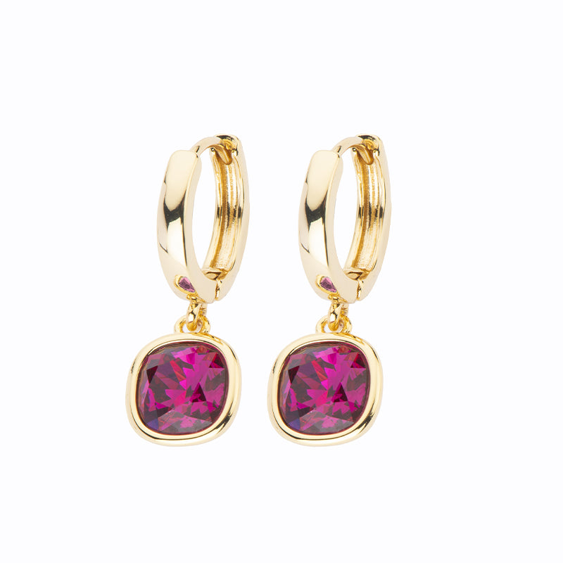 Orecchini a creola in brass liscio e dorato/rodiato con pendente carrè in cristallo fucsia/ottanio/light sapphire.